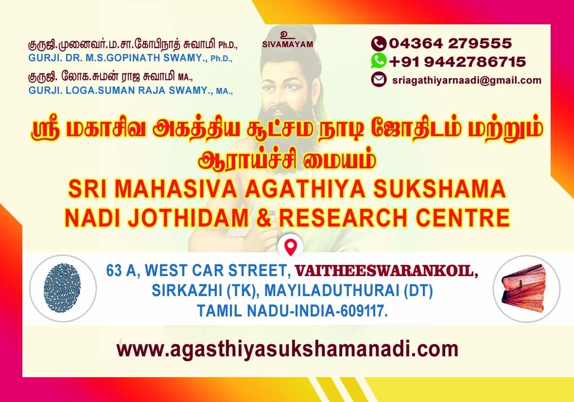 • Even in this digital age, seekers prefer authentic palm leaf readings over computerized predictions. The Sri Mahasiva Agathiya Sukshama Nadi Jothidam and Research Center blends traditional wisdom with modern communication—offering both in-person and online consultations for global clients.